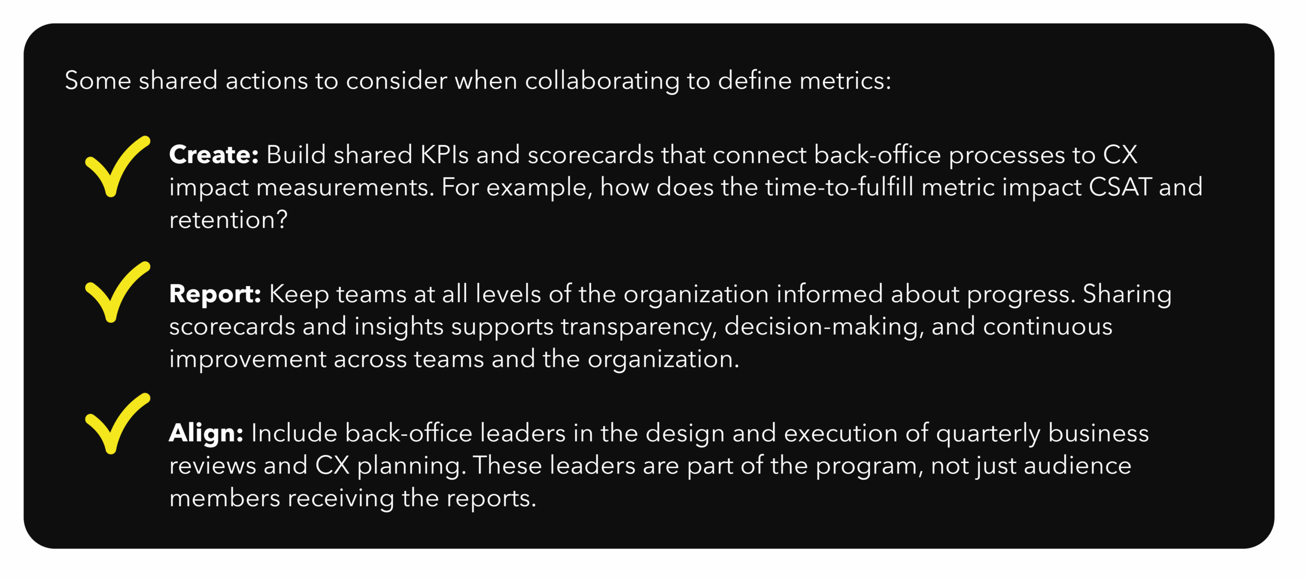 As back-office functions become more integrated into CX strategy development, they should also play an active role in defining the metrics that connect their work to broader business outcomes. When frontline and back-office leaders collaborate around shared CX metrics, silos give way to joint accountability. The conversation shifts from “keeping the lights on” to “fueling growth,” taking advantage of all parties at the strategy table. This alignment empowers organizations to innovate, break down bottlenecks, and deliver seamless customer journeys while reducing internal friction for employees.