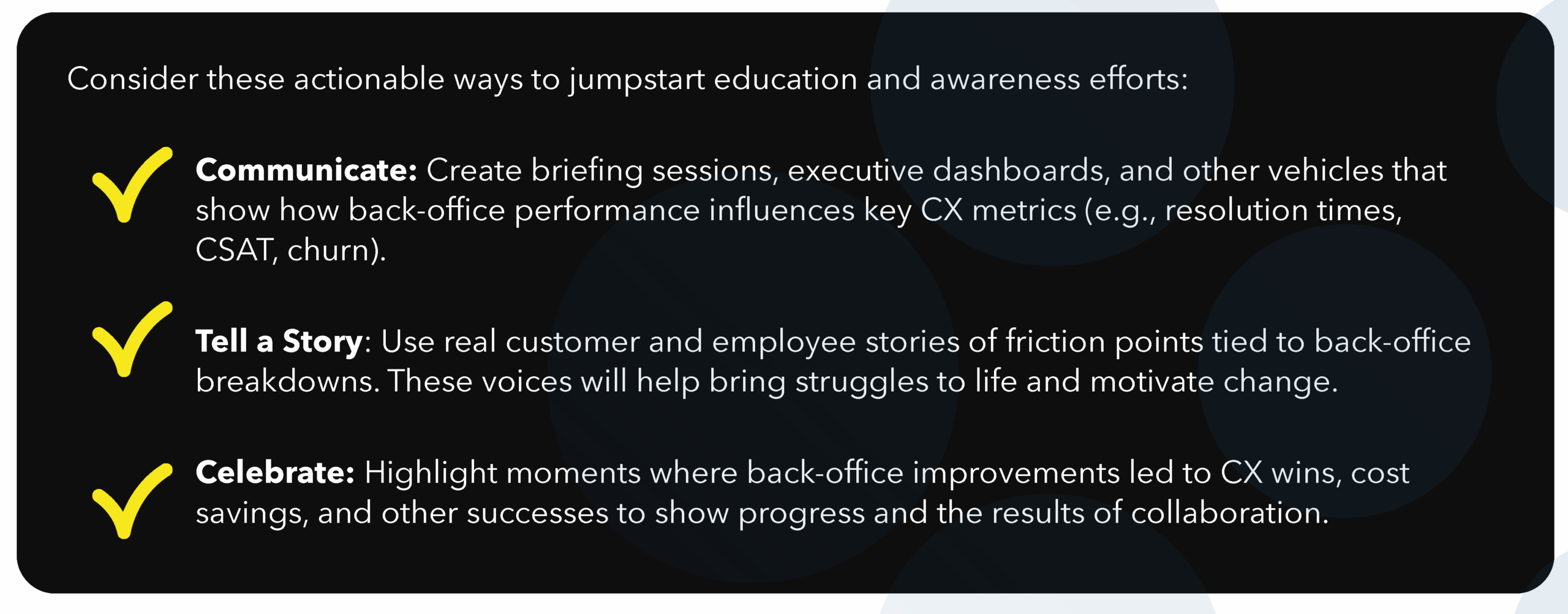 Leaders have a variety of options to increase back-office contributions to the customer and employee experience. One starting point is managing up using education and awareness campaigns to help executives and peer leaders recognize the back office as a strategic lever, not just a support function. Equally important is elevating back-office voices in CX strategy discussions, ensuring that the people closest to operational processes have a significant influence in shaping the customer journey.