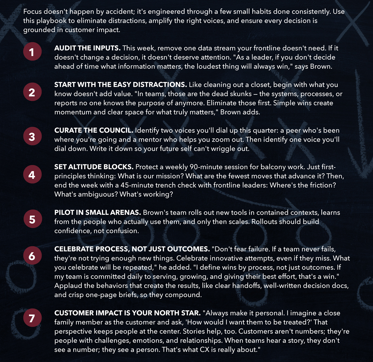 One of Brown’s most useful operating models is what he calls leadership altitude. Some days demand the balcony; others require the trenches. The point isn’t to pick one; it’s to know your current altitude and communicate accordingly.
