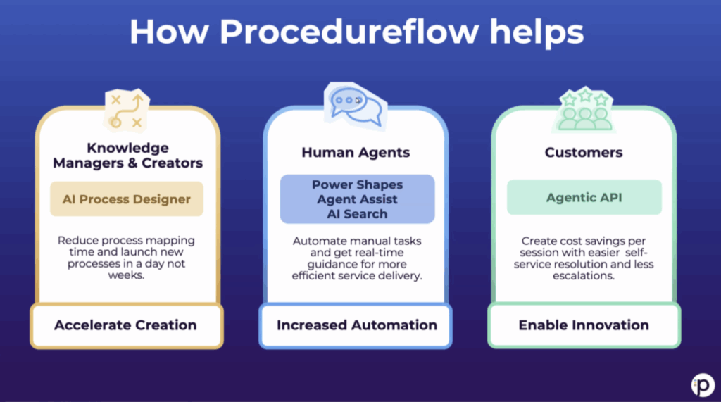 Procedureflow serves three audiences: Knowledge Managers accelerate creation, Human Agents get increased automation, and Customers benefit through agentic APIs.